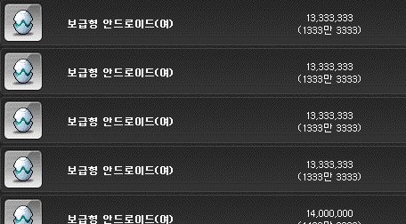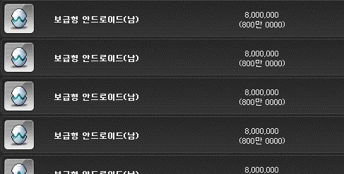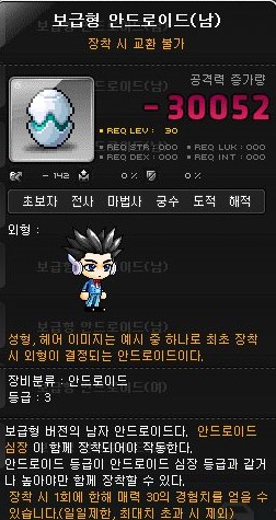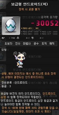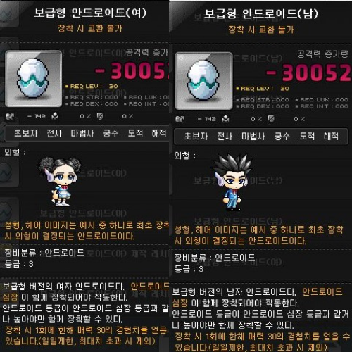 보급형 안드로이드(여)는 1300만 메소, 보급형 안드로이드(남)는 800만 메소이다.