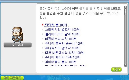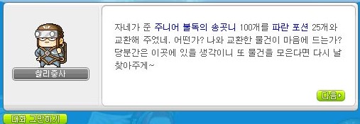 나오는 보상은 만병통치약15개, 레몬15개 하얀포션15개, 파란포션25개, 가공된나무30개, 귀 장식 지력 주문서 10% 1개이다.