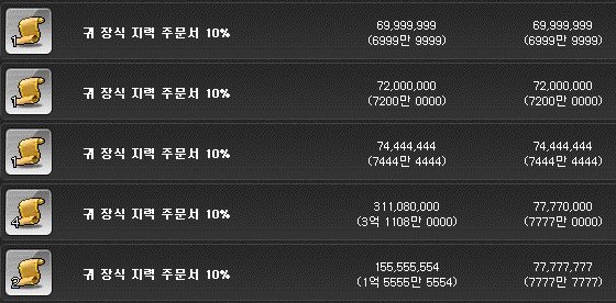 귀 장식 지력 주문서 10%는 7000만 메소에 판매 중이다.