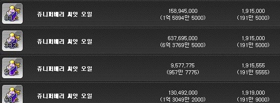 쥬니퍼베리 씨앗 오일은 개당 191만 메소이고, 7개를 구매하면 약 1340만 메소를 지출.