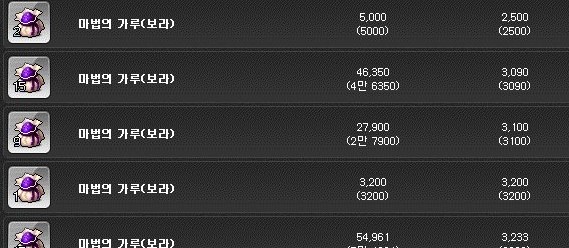 마법의 가루(보라)는 개당 2500메소이고, 5개를 구매하면 약 1만 2천메소를 지출.