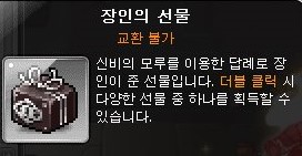 오늘은 장인의 선물을 통해 핑크빈 모자를 얻는 방법에 대해 소개하도록 하겠다. 그리고 장인의 선물에서 무엇이 나왔는지에 대해서도 소개하도록 하겠다. 장인의 선물은 이렇게 생겼다. 신비