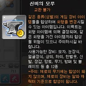모자는 모자끼리, 무기는 무기끼리. 같은 종류의 부위에만 모루가 가능하다.