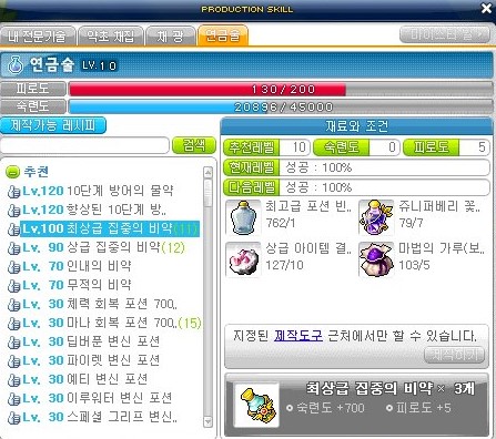 추천 레벨은 10레벨이므로 연금술 10레벨까지는 올려야 한다.