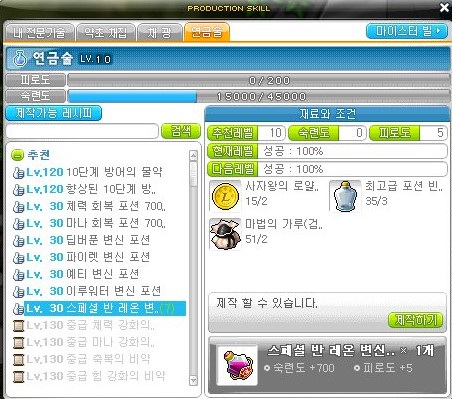연금술 10레벨 기준으로 숙련도 700이 오르고, 피로도 5가 소비된다.