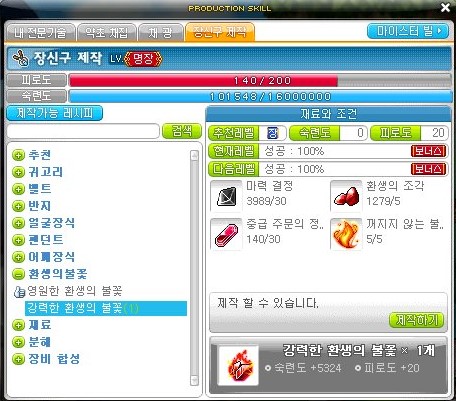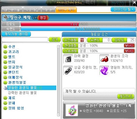 장신구 제작 장인을 달성해야 제작할 수 있고, 숙련도 5324가 오르고 피로도 20이 소비된다.