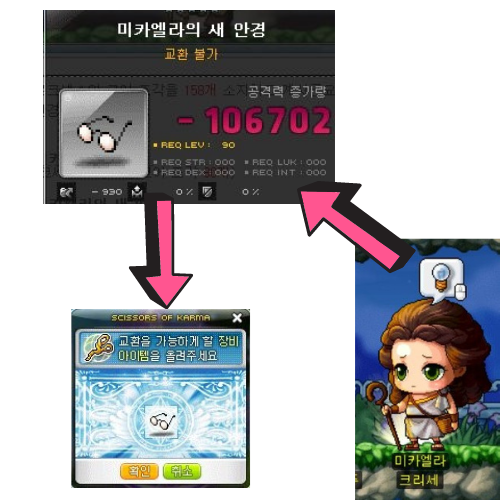 아무튼 추옵을 띄웠다면 실버 카르마의 가위를 이용하여 안경을 잘라주면 된다.