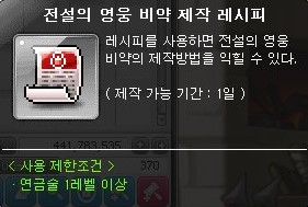 제작 가능 기간은 1일이고, 사용 제한조건은 연금술 1레벨 이상이다.