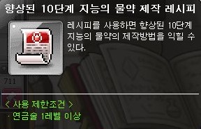 제작 가능기간이 없고, 사용 제한조건은 연금술 1레벨 이상이다.