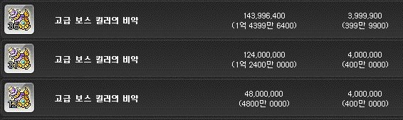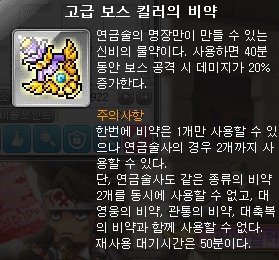 고급 보스 킬러의 비약은 40분 동안 보스 공격 시 데미지가 20% 증가하는 비약이다.