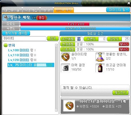 제작하면 숙련도 5324가 오르고, 피로도 25가 소비된다.