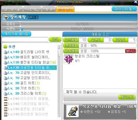 유의할 점은 장비 제작 10레벨을 기준으로 성공률이 90%이다.