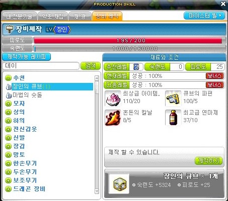오늘은 장비 제작 돈벌이 5탄, 장인의 큐브를 준비했다.
