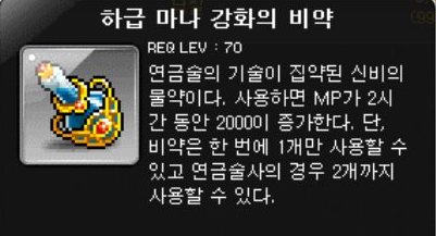 하급 마나 강화의 비약은 사용시 2시간 동안 MP가 2000이 증가하는 비약이다.
