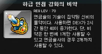 하급 민첩 강화의 비약은 사용시 2시간 동안 DEX가 40이 증가하는 비약이다.