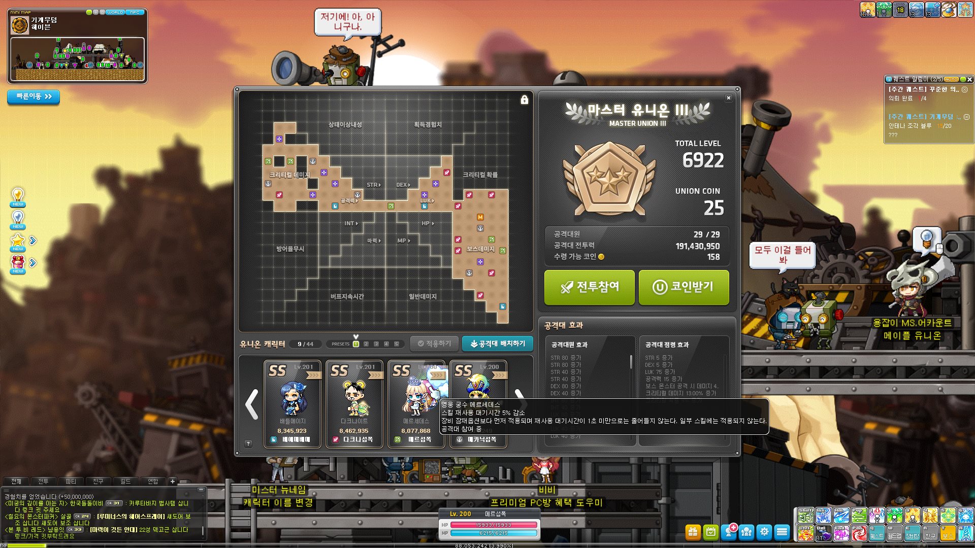 메르 200레벨 유니온 효과는 스킬 재사용 대기시간 5% 이다.