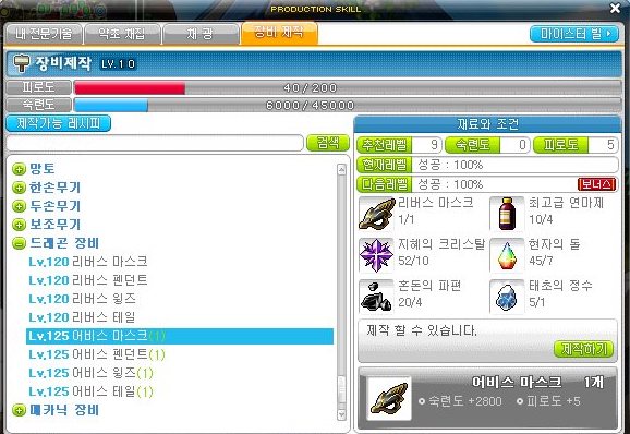 제작을 하면 숙련도 2800과 피로도 5가 소비된다.