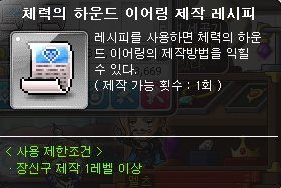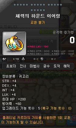 체력의 하운드 이어링은 전직업 착용 가능한 130제 올스텟 4와 최대HP 200을 높여주는 귀고리이다.