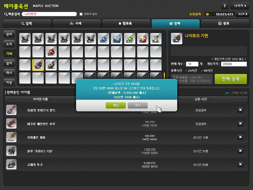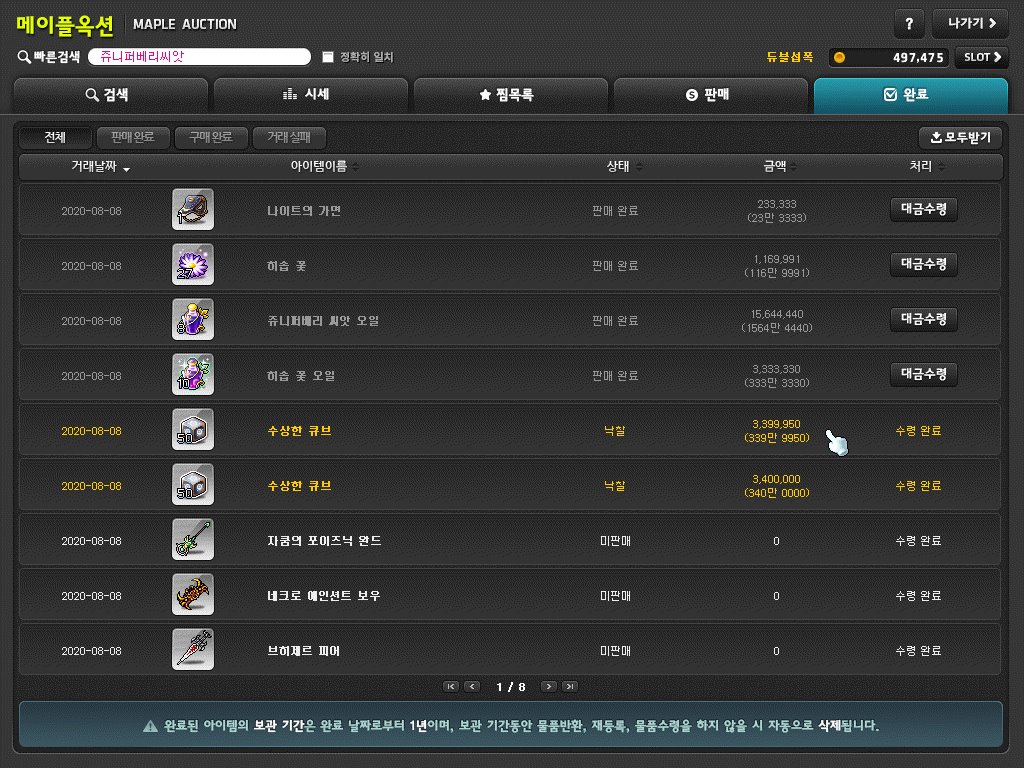 보다시피 나이트의 가면 1개가 팔릴 동안에 채집 템들은 거의 다 팔렸다. 그리고 가격 또한 어마 무시한 것을 볼 수 있다. 특히 쥬니퍼베리 씨앗 오일은 8개만 팔았는데도 1500만 메소를 벌어들일 수 있다.