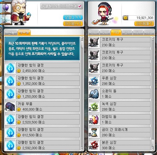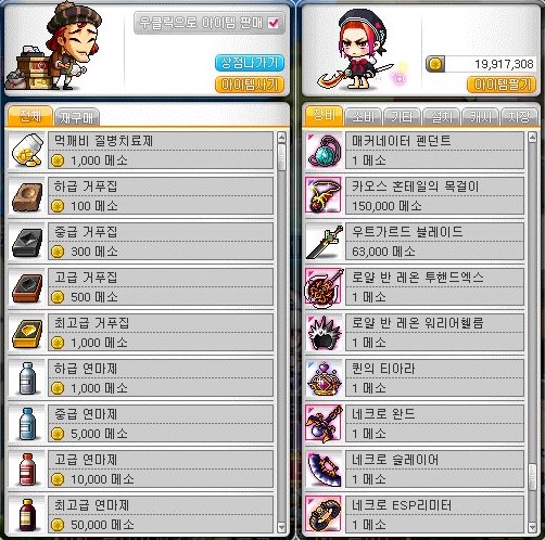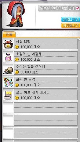 어쨌든 우리는 상점에 팔면 1메소짜리 템들을 비싼 아이템으로 만들었다.
