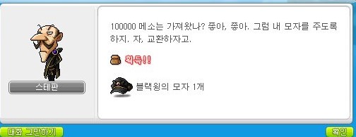 아무튼 10만 메소를 내고 블랙윙의 모자를 얻을 수 있다.
