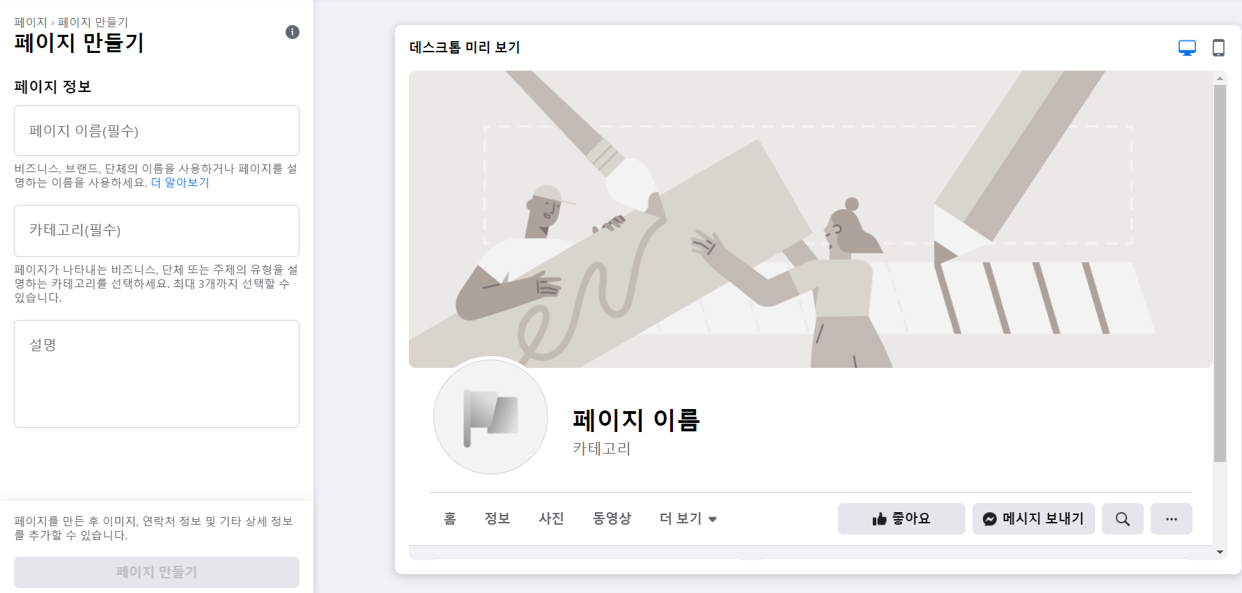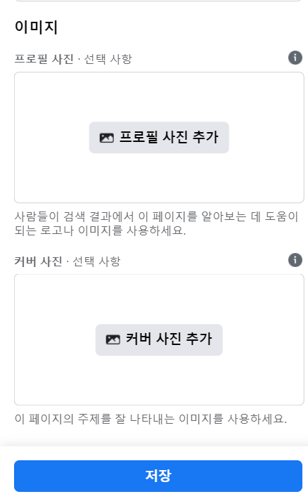 다 입력하고 페이지 만들기를 누르면 아래에 이렇게 프로필 사진과 커버 사진을 설정하는 부분이 나온다.