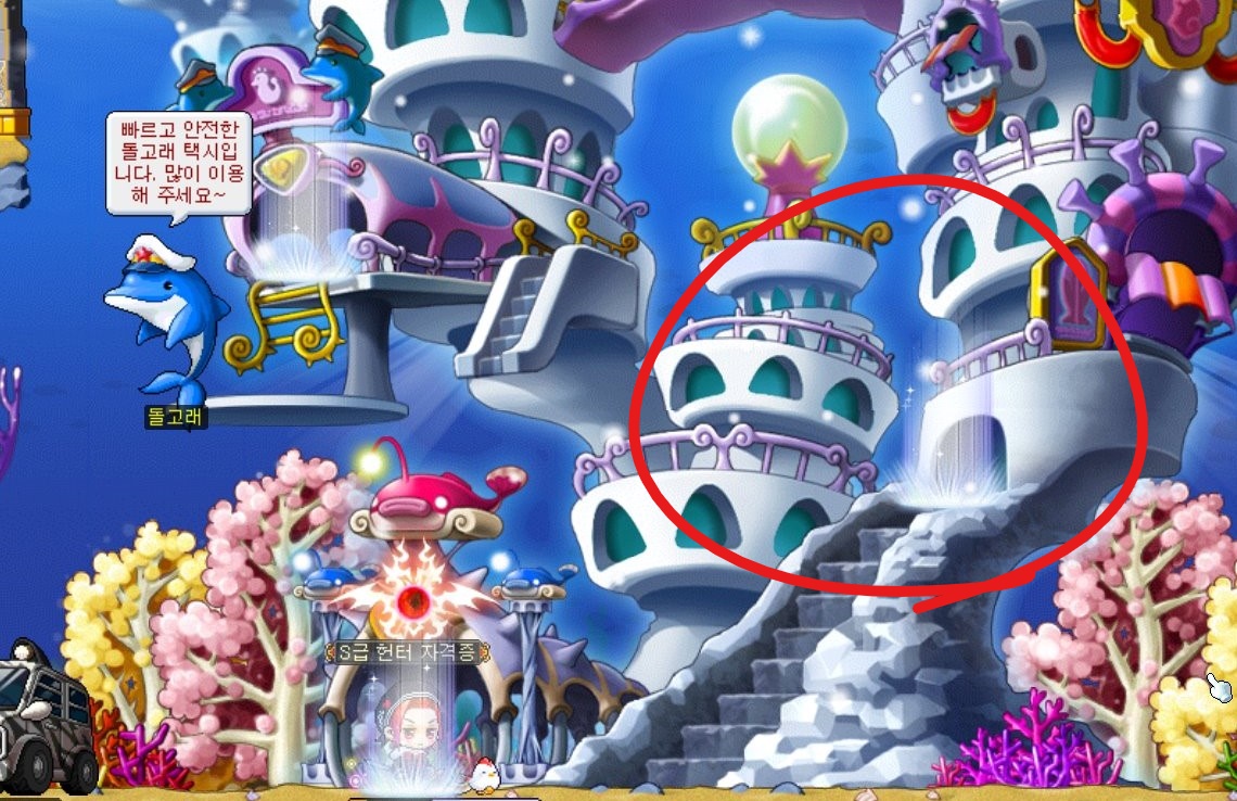 아쿠아리움으로 와서 가운데 부분의 건물들 중에서 표시한 오른쪽 포탈을 타 준다.