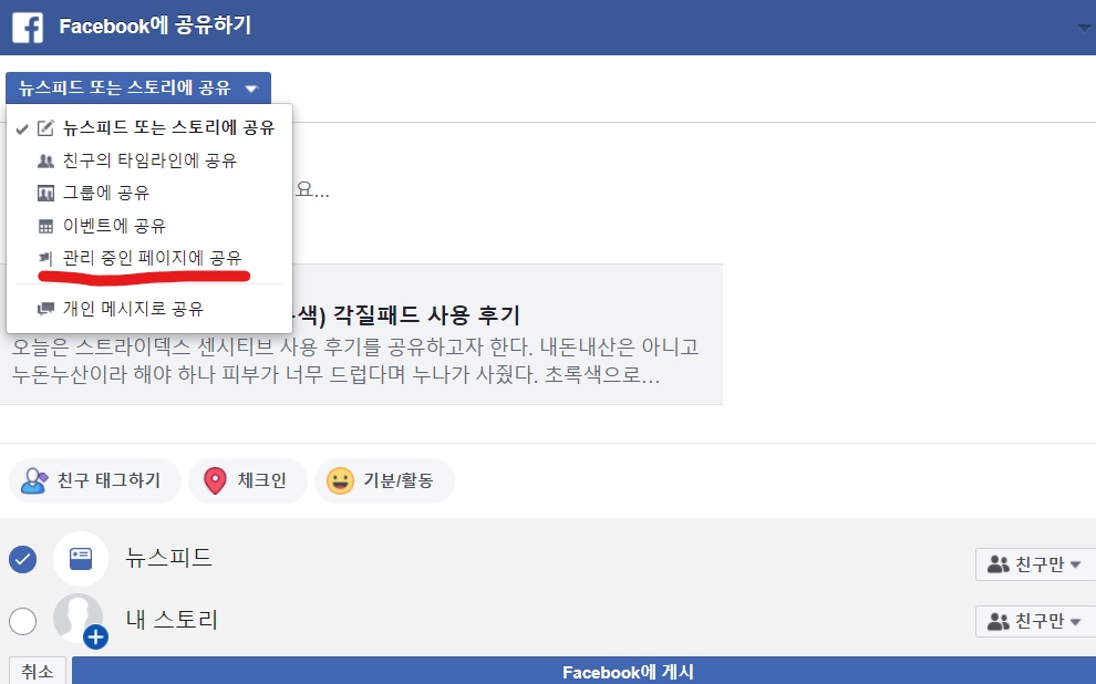 그리고 자신의 페이지를 선택하고 글의 제목이나 소개 정도 작성한 뒤 게시하기를 눌러준다.