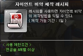 제작 가능 기간은 1일이고, 사용 제한조건은 연금술 4레벨 이상이다.