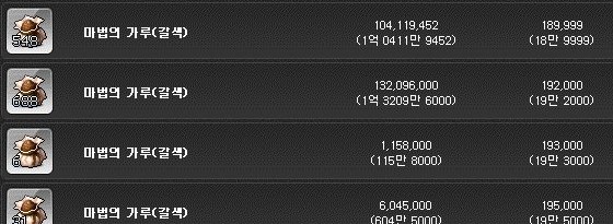 마법의 가루(갈색)은 개당 19만 메소. 5개가 필요하니 95만 메소를 지출하였다.